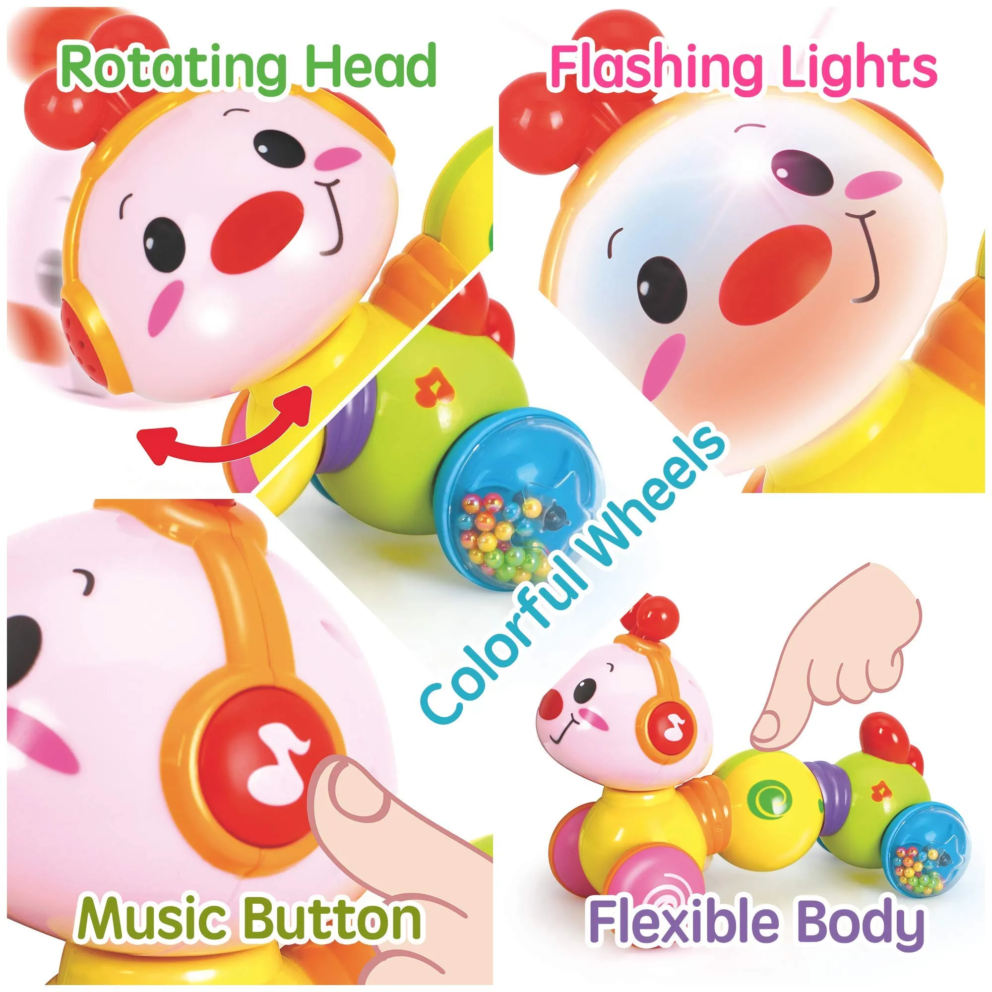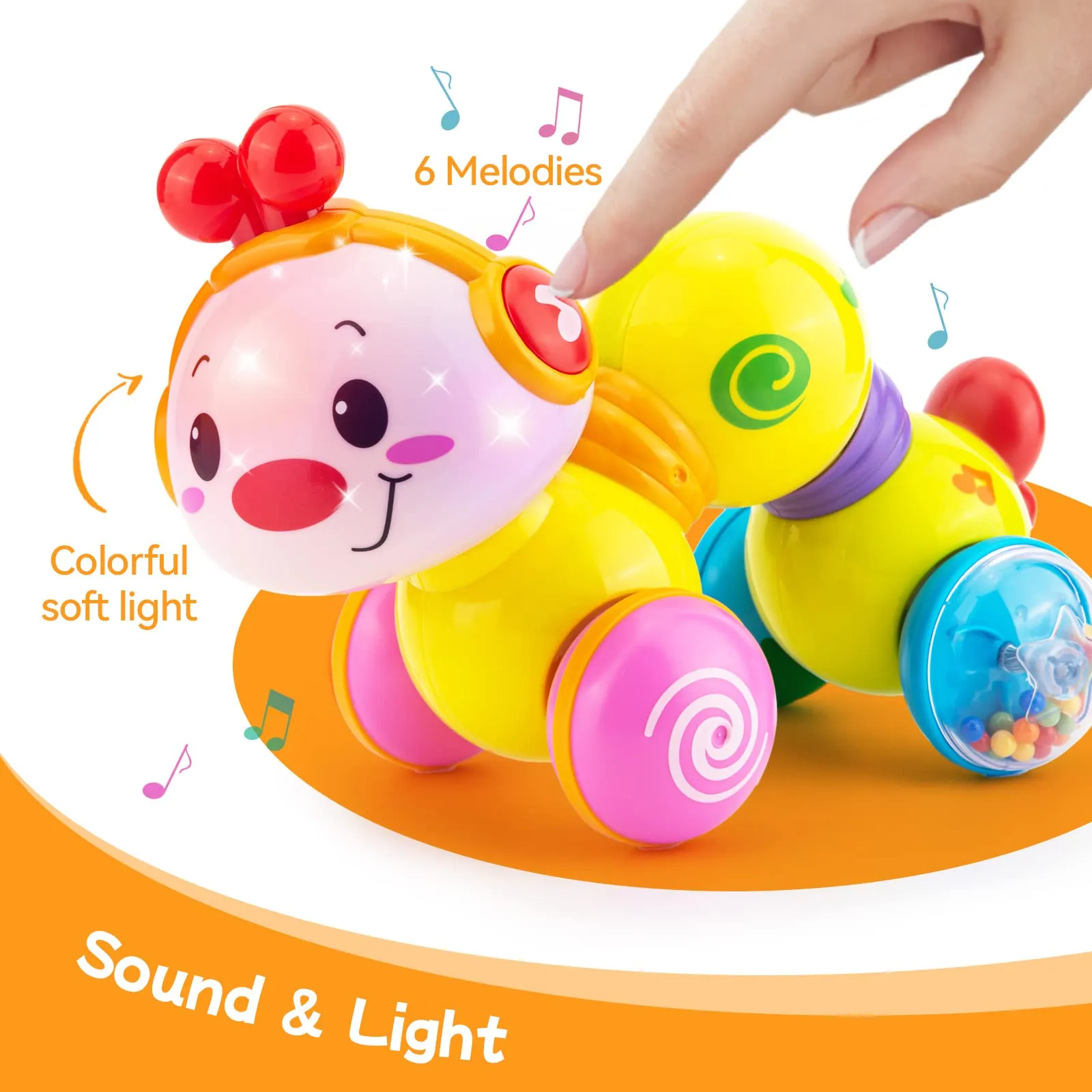 - When press the body of baby toys and then release, it will move with happy baby tunes music, rattling beads & lights. The baby crawling toys are very attractive which will encourage your baby to crawl & chase.
