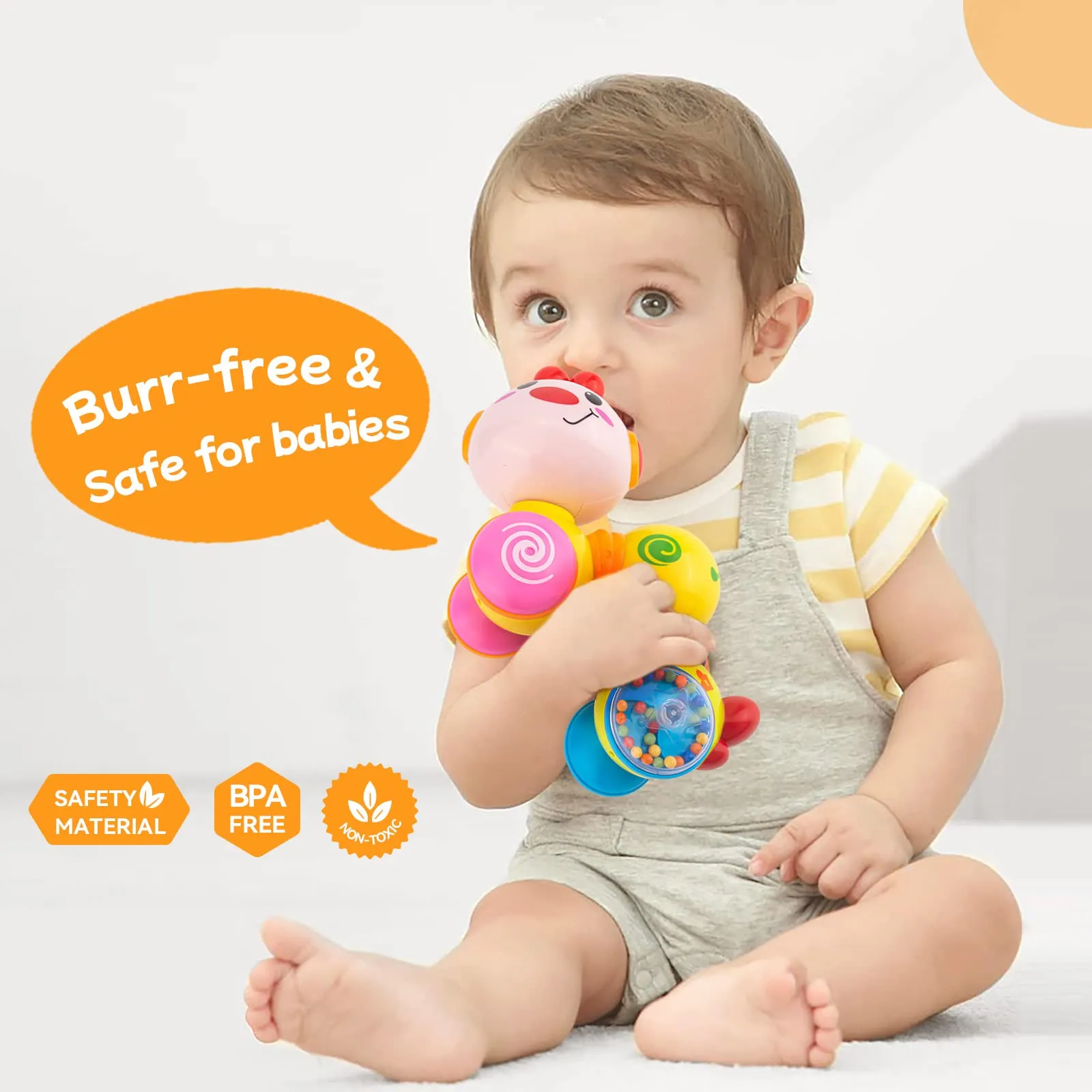 This Caterpillar toy’s head rotates and plays fun sounds; press a button to hear 6 different kids’ songs; colorful wheels that rattle and flexible body will inspire curiosity and the desire to play and learn