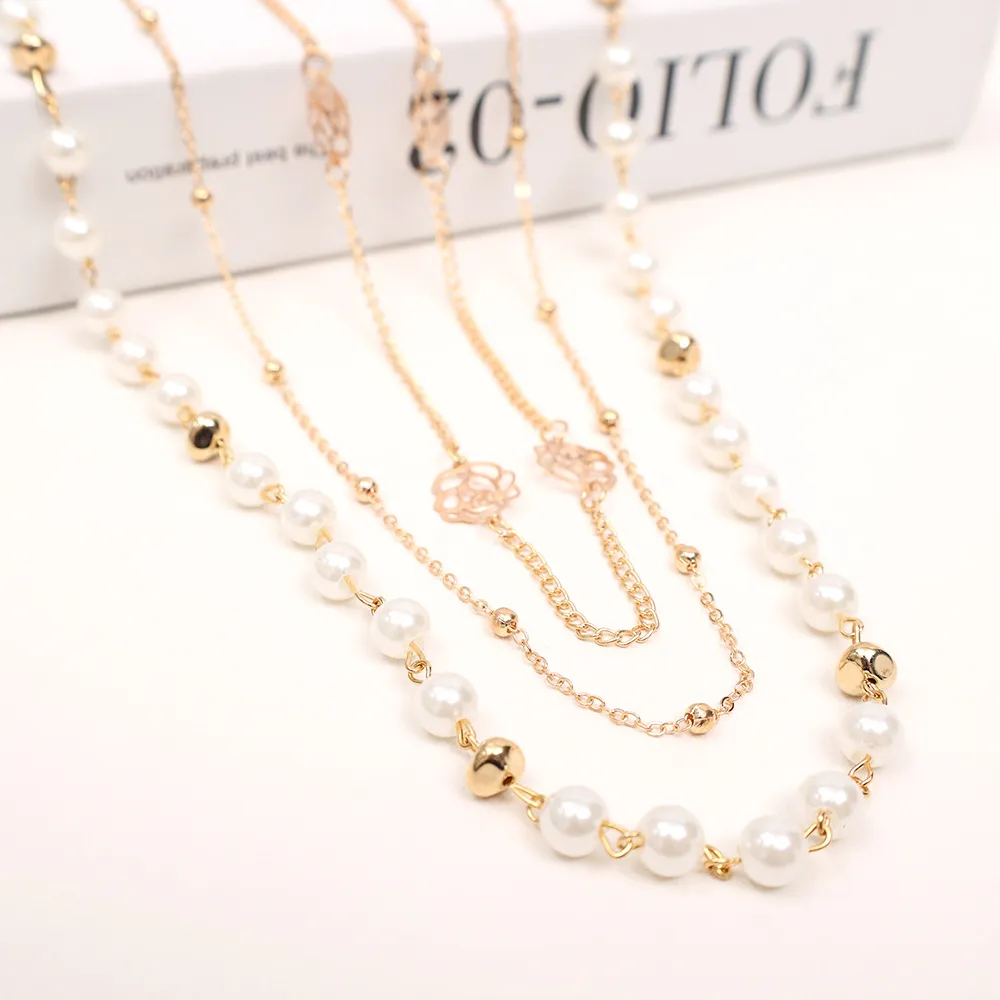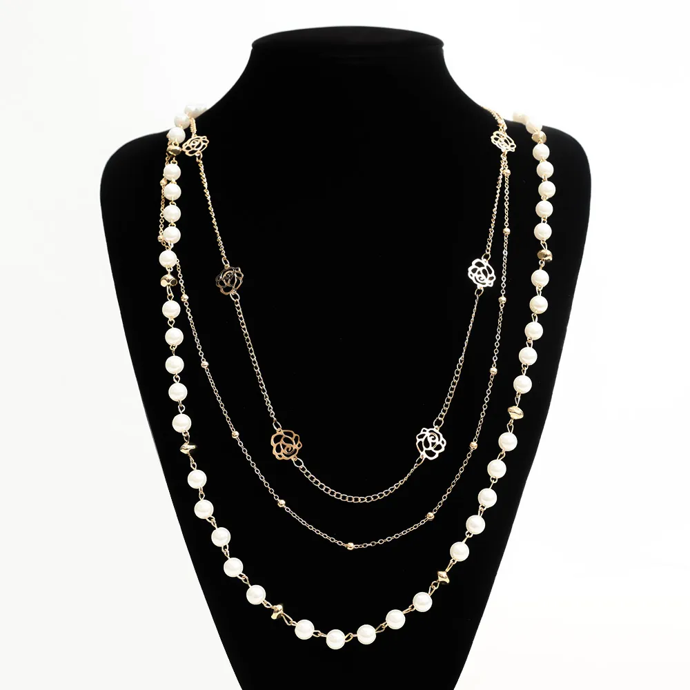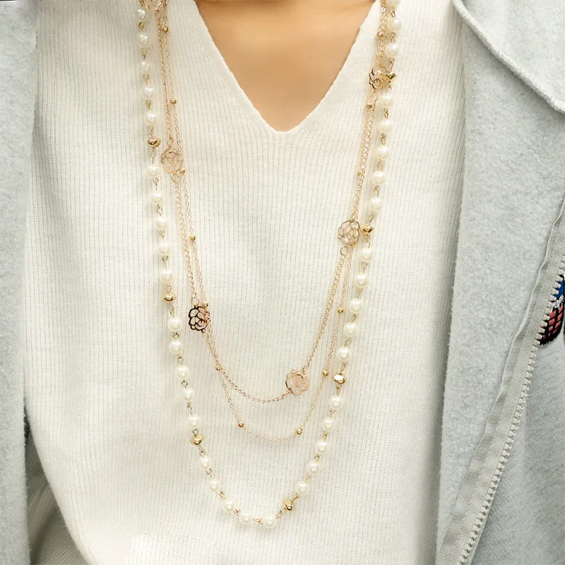 Multilayer Rose Pearl Long Necklace Temperament Sweater Chain Necklace for Woman Fashion Jewelry Accessories