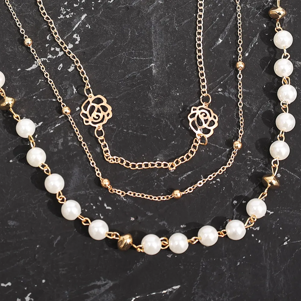 Luxury Multilayer Rose Pearl Long Necklace-Gold Color