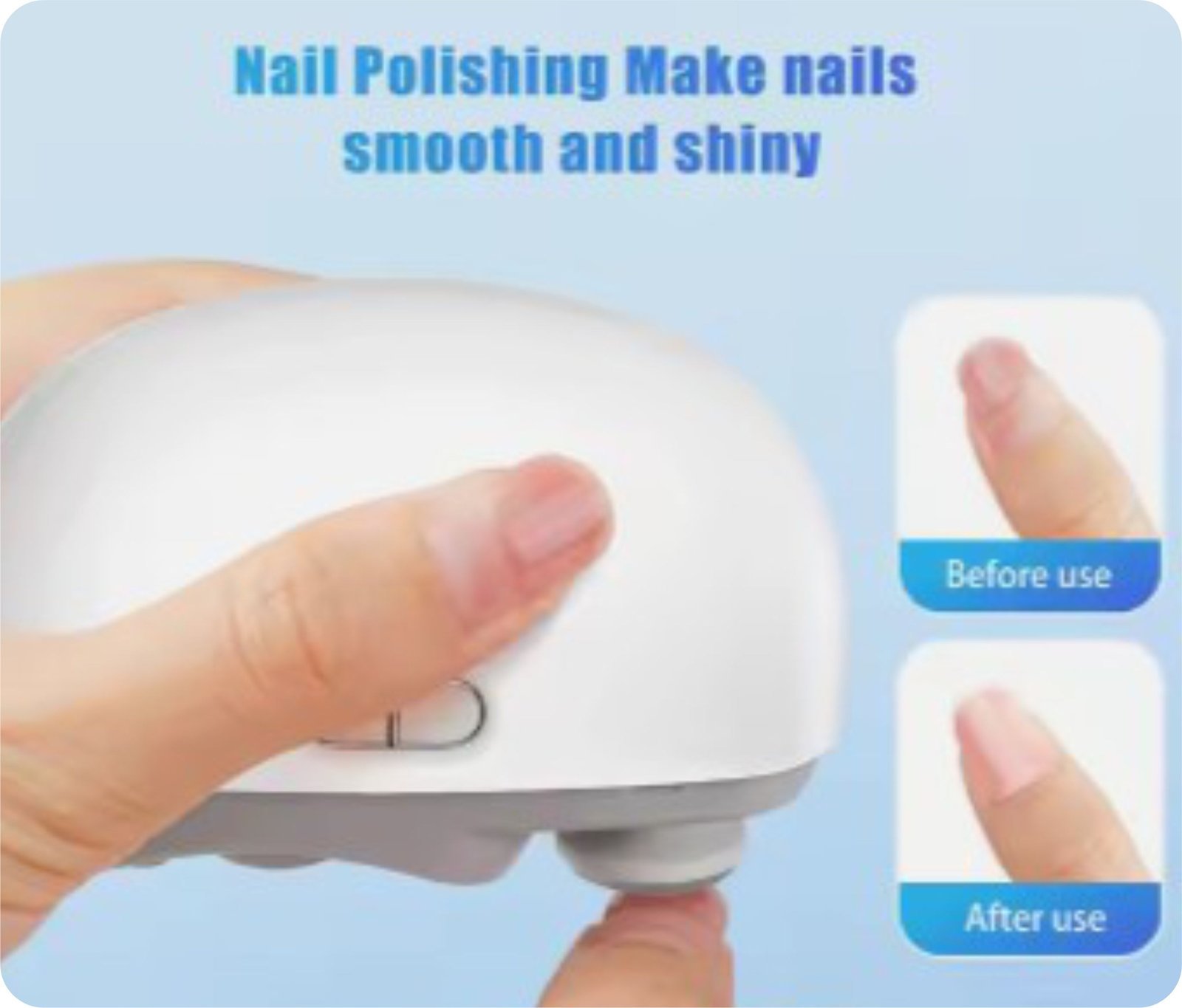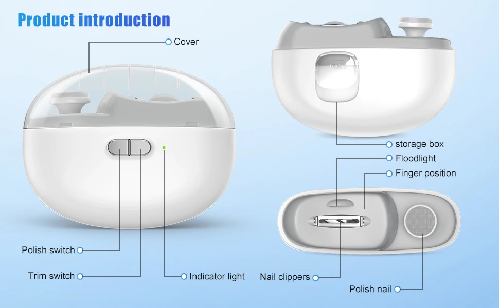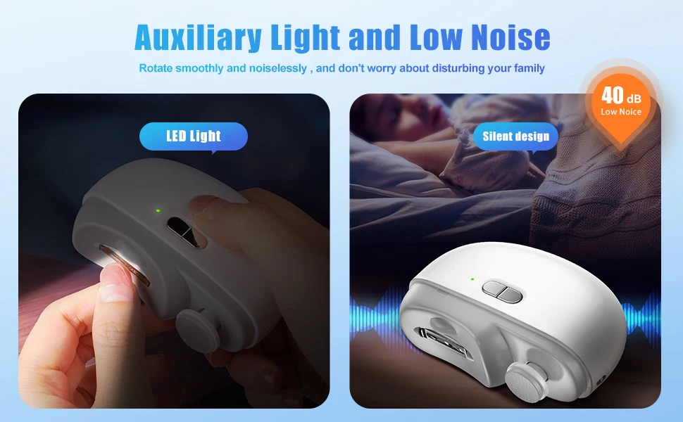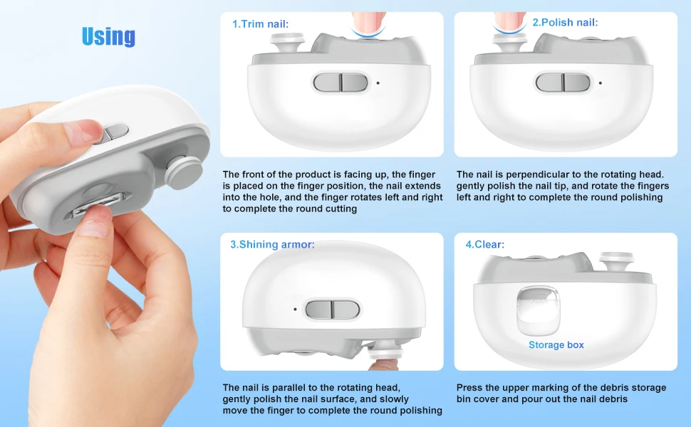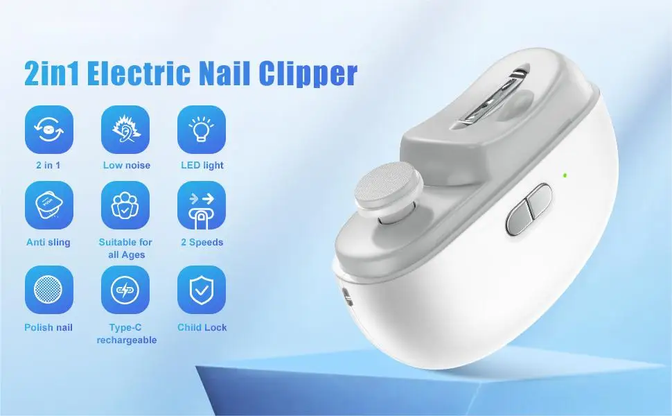 5.One-button operation, two-speed adjustment. The adjustable speed function allows the electric clipper to be used for both infants and adults. The low-speed setting is ideal for gentle polishing of nails for children aged 0-1, while the high-speed setting is suitable for adults.